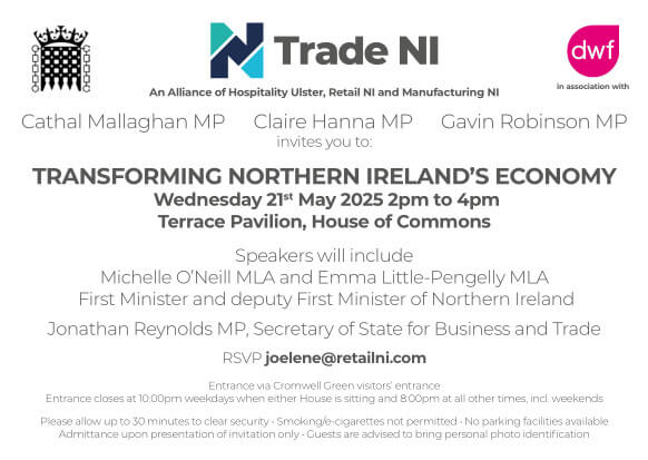 Save the Date Trade NI will be hosting its Annual Business & Economy Reception on 22nd May 2024 in the House of Commons in association with DWF and Titanic Quarter. The reception will start at 2pm, if you haven’t secured your spot contact joelene@retailni.com who will be able to help.
